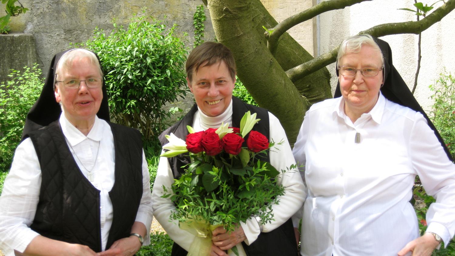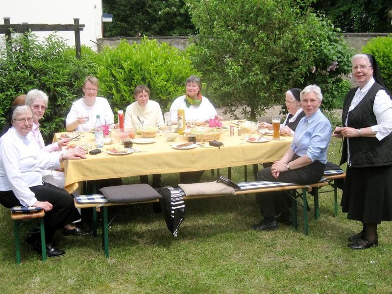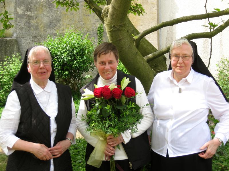 Zum Dank an Sr. M. Veronika, die lange Jahre die Letztverantwortung im Michaelskloster getragen und das Leitungsamt am 17. Mai 2016 abgegeben hat, lud ihre Nachfolgerin, Sr. M. Ancilla, den Konvent zum Grillen, Feiern und Beten in den Klausurgarten ein. Jede Schwester trug ihren Teil zum Gelingen bei, Sr. M. Theresia und Sr. M. Antonia, ihre Weggefährtinnen seit Noviziatstagen, überreichten Sr. M. Veronika einen Blumenstrauß, verbunden mit sinnigen Gedanken zur Rose und zur Lilie. Als Geschenk des Konventes überbrachte Sr. M. Ancilla einen Gutschein für eine Pilgerreise nach Lourdes.