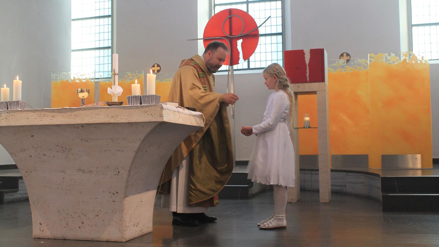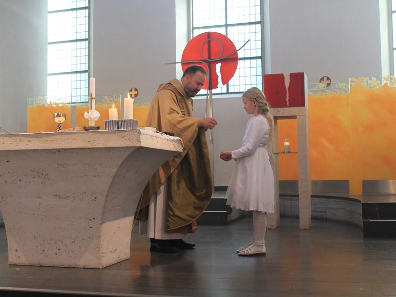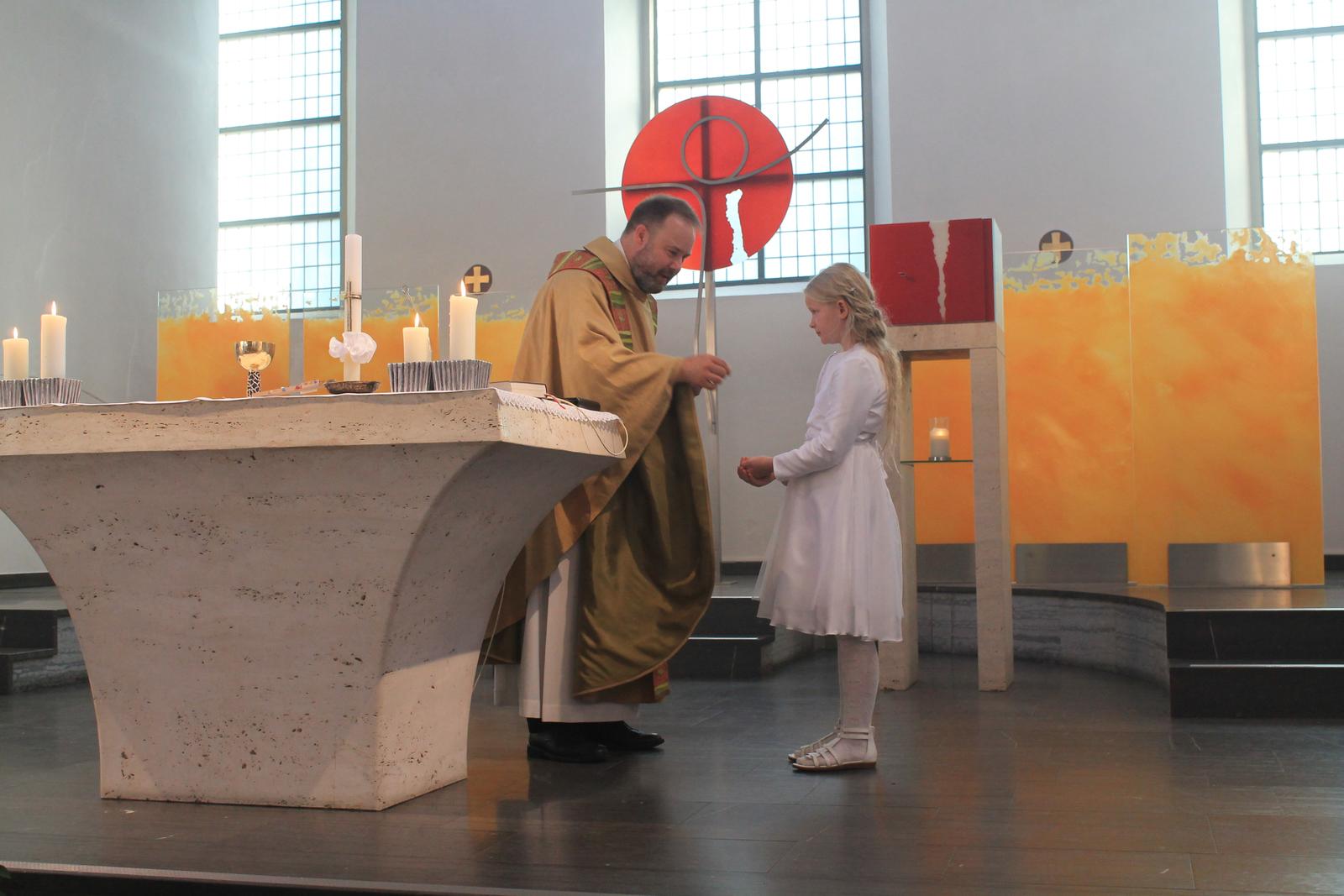 Im Rahmen unserer Konventmesse feierte Sophie Finke zusammen mit uns Schwestern, dem Schulseelsorger Pastor Achim Hoppe, ihren Eltern, ihrer Schwester und einigen Verwandten den erstmaligen Empfang der heiligen Kommunion. Festlich gekleidet und sichtlich ergriffen von diesem Ereignis schenkte sich ihr der Herr selbst im Zeichen des Brotes.