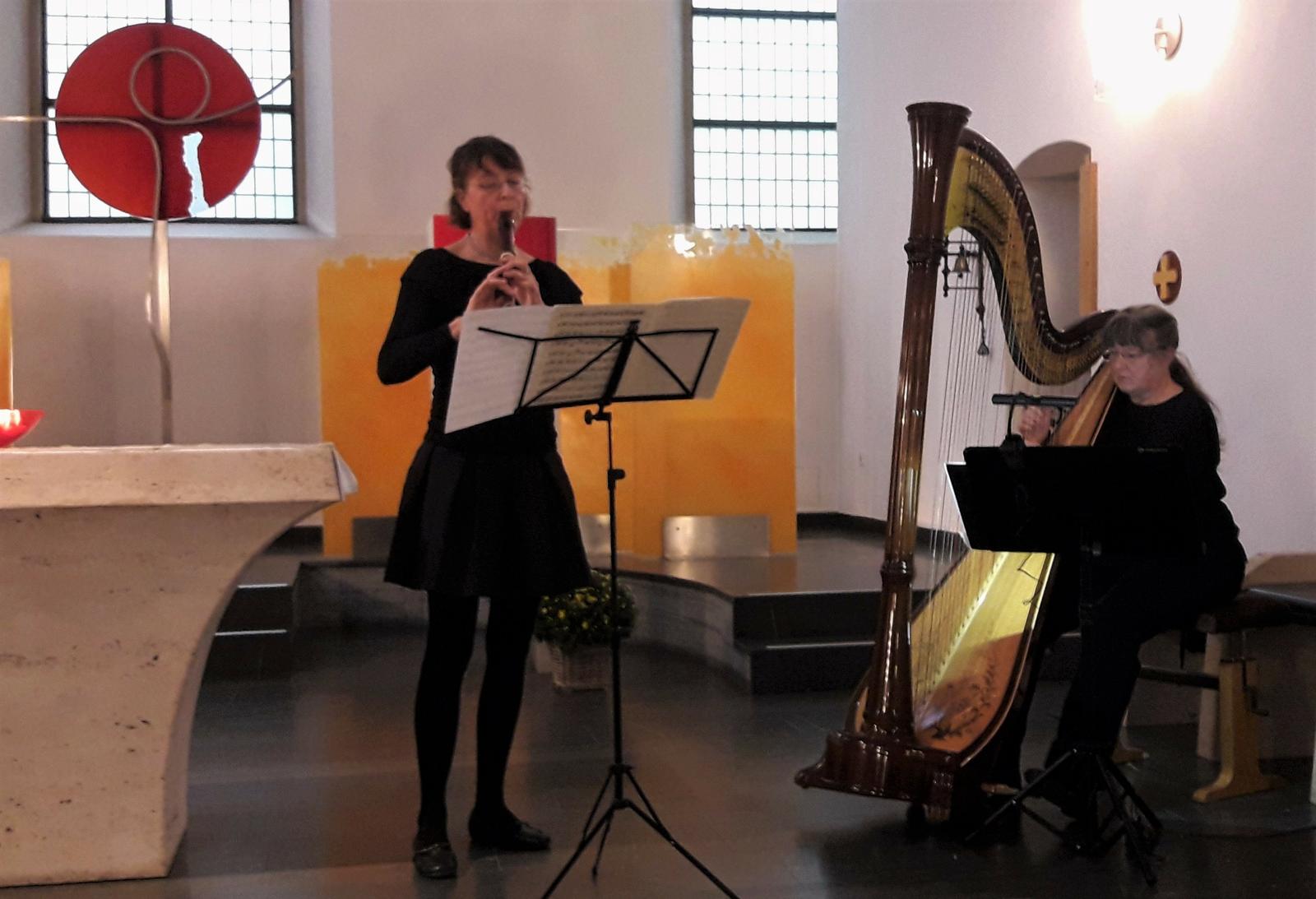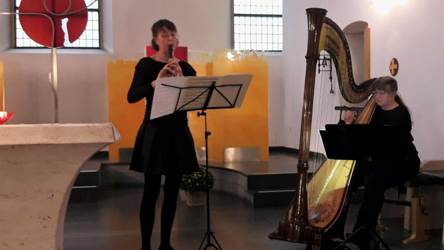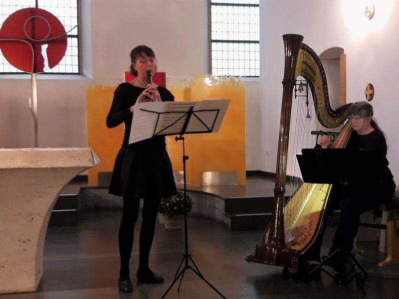 Ergänzt wurde das Programm durch mehrere meditative Stücke, die die Harfinistin Clotilde Oelmüller sehr einfühlsam spielte, teilweise begleitet vom Flötenspiel der Chorleiterin.