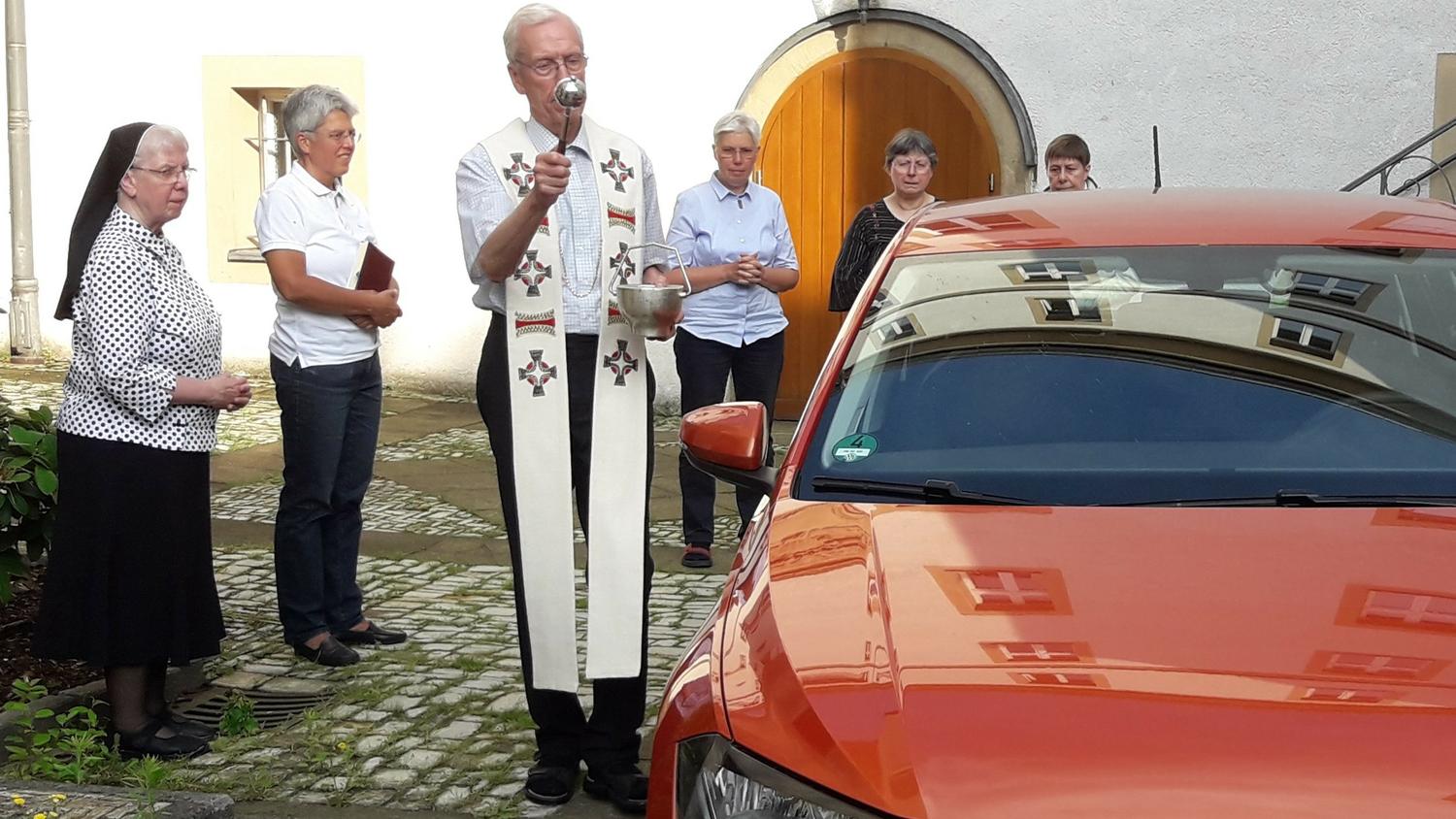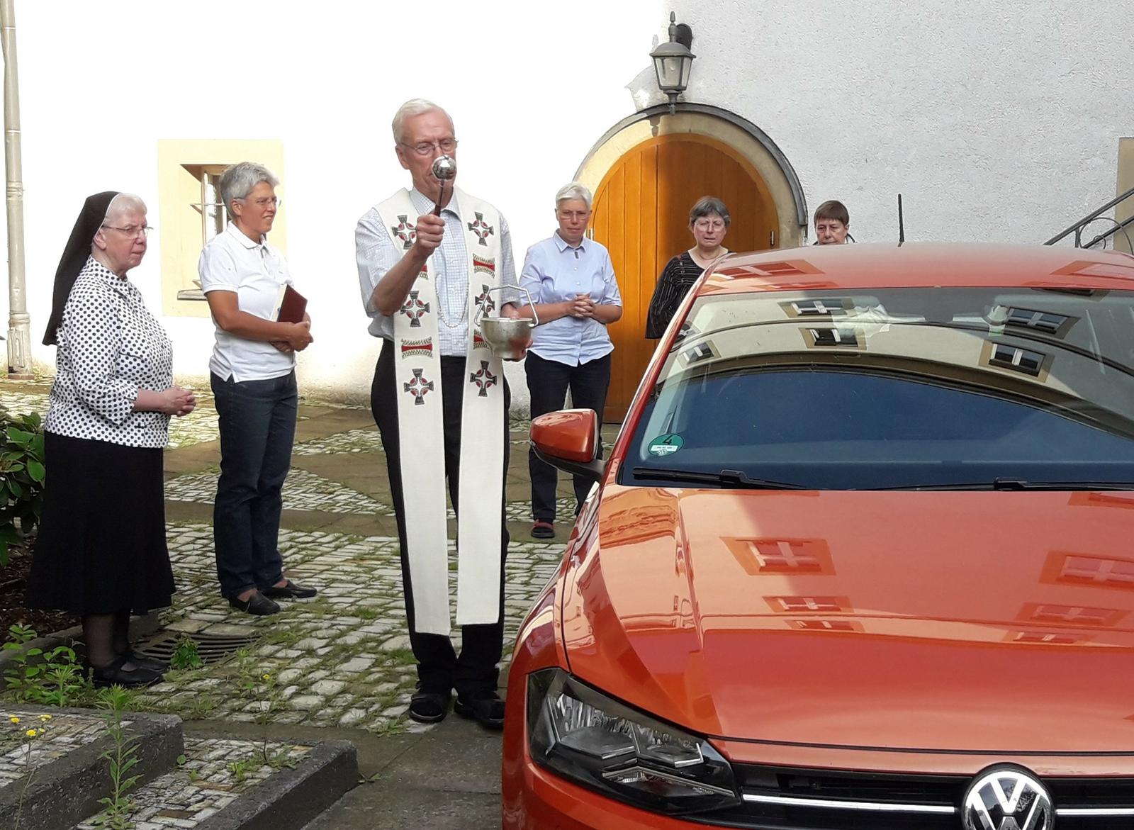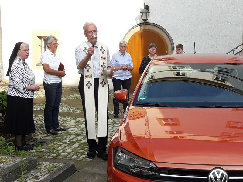 Gestern Abend hat Pastor Brammen, Sr. M. Theresias Bruder, das neue Auto gesegnet, aber auch alle in das Gebet einbezogen, die am Straßenverkehr teilnehmen und Mitverantwortung tragen, dass alle gut an das Ziel ihrer Reise kommen. “Gott befiehlt seinen Engeln, dich zu behüten auf all deinen Wegen” (Ps 91,11).
