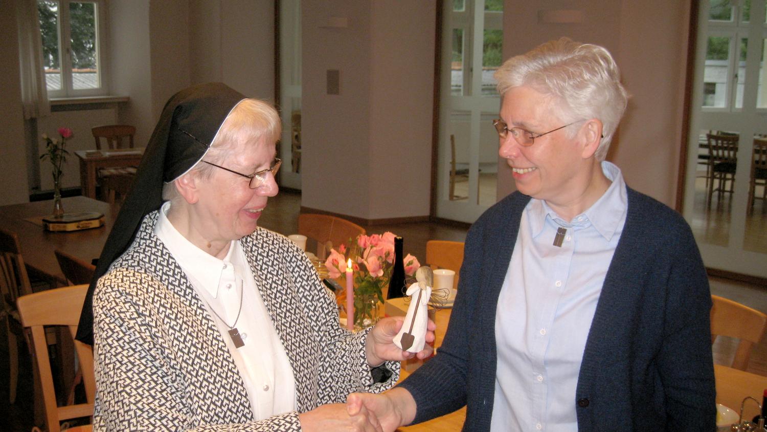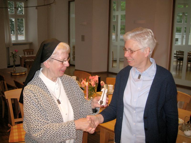 Nach der Eucharistiefeier gratulierten wir im Konvent. Sr. Ancilla stellte in ihrer Rede eine enge Verbindung her zwischen dem Engel des Gartens und guten Wünschen für Sr. Theresia: Als begeisterte und beharrliche „Gärtnerin“ in Kloster und Schulen St. Michael möge sie sich die heilsame Ausgewogenheit zwischen Aktion und Kontemplation bewahren und sich zwischendurch wie der abgebildete Engel auf ihrem „Spaten“ ausruhen.