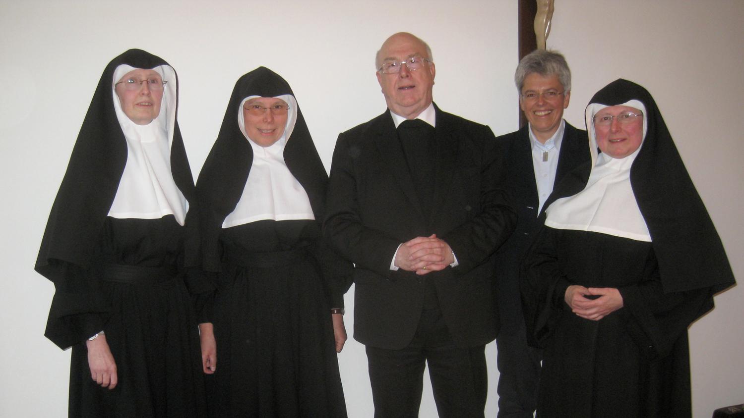 von links: Sr. M. Ulrike Brand, Assistentin und Lehrerin am Gymnasium St. Michael; Sr. M. Ancilla Ernstberger, Oberin und Lehrerin an der Realschule St. Michael; Erzbischof Hans-Josef Becker; Sr. M. Laetitia Eberle, 2. Ratsfrau, Ökonomin des Klosters; Sr. M. Gabriela Zmuda, 1. Ratsfrau